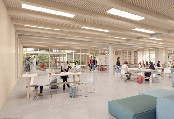 Lehrküche, Bibliothek wie auch die Fachräume für Musik im Erdgeschoss können über große Verglasungen mit der Halle interagieren, haben aber auch alle direkten Zugang zu den Außenan-lagen.