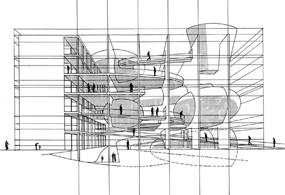 Der Kubus befreit sich aus seiner Isolation, indem er vielfältige Bezüge zur Umgebung entwickelt: So führt vom Schinkelplatz aus eine ansteigende Rampe in das Zentrum des Gebäudes, quer dazu verläuft, in den Boden sich eingrabend, eine Bewegungsrichtung, die zwischen Schloßplatz und Werderschem Markt vermittelt. Weiter oben ist eine "Schinkel-Galerie" auf den Blick zum Alten Museum ausgerichtet. Der Weg durch das Innere des Hauses könnte einem Weg durch eine Gebirgslandschaft ähneln; er führt über Schluchten hinweg in höhlenartige Räume, dann auf Aussichtsplateaus usw.