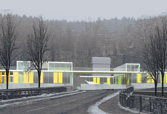 Das Dach, auf der Ebene des Plateaus, ist im Prinzip öffentliche Grünfläche, in die die Sportaußenanlagen eingebettet sind. Von hier aus geht der Blick in Richtung Innenstadt und Nagold. Über dieses Plateau ragen lediglich zwei oder drei Baukörper von minimierter Kubatur. Sie alternieren innerhalb einer bandartigen Struktur mit den zwei Höfen: dem öffentlichen Eingangshof und einem internen, dem Fitness-/Wellnessbereich zugeordneten Hof.
