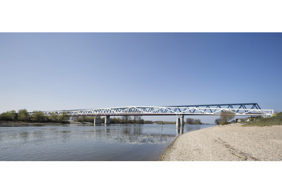 Gewünscht war eine parallele Führung der neuen Fußgängerbrücke zu einer gerade erst fertiggestellten Brücke der Deutschen Bahn. Dies schafft eine besondere entwurfliche Situation, da die Fuß- und Radwegbrücke als Objekt nicht für sich allein wirkt, sondern zusammen mit der benachbarten Bahnbrücke wahrgenommen wird. Als Antwort auf diese Randbedingung wird ein Stahlfachwerk in Variation der Bahnbrücke errichtet, wobei Kontur und Profilierung des Fachwerks gestalterisch und konstruktiv abgewandelt werden.