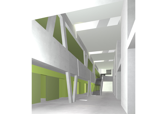 Lesbar wird diese räumliche Entwicklung über mehrere "Infrastrukturwände", an die sich die Nutzungen anlagern. Zwischen den Gebäuderiegeln, nur durch Glaswände abgetrennt, verläuft der Außenraum scheinbar durchs Haus. So wird der an der Südseite liegende Eingang mit dem nordöstlichen Hof verbunden.
