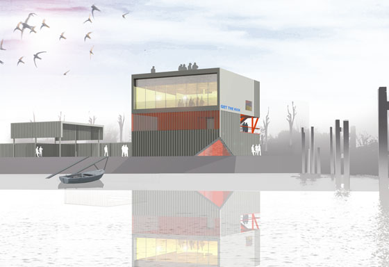 Bei der Wahl eines hohen, kubischen Baukörpers stand der Wunsch nach einem zeichenhaften Bau für das Haus der Projekte im Vordergrund, der selbstbewusst an der Hafenfront in Erscheinung tritt. Die allseitig orientierte Form des Gebäudes ermöglicht eine Hinwendung sowohl zum Hafen, als auch zum Zugangsweg über Brücke und Deich. Auf Blickhöhe des Zugangsweges liegt im 1.OG eine offene auch farblich hervorgehoben Ebene, die sich als Fuge in der Fassade abzeichnet. Hier ist die Küche mit vorgelagerter Loggia als Empfangszone angeordnet. Die Seminarräume im Obergeschoss sind über großzügige Verglasungen direkt zum Wasser orientiert.