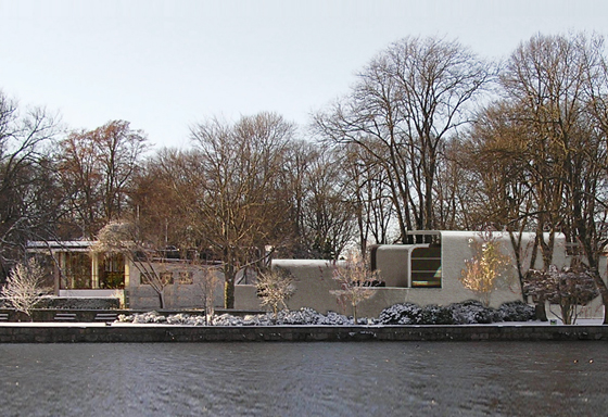 Die Arbeit beginnt mit einer schlichten Umfassungsmauer, die an das Bestandsgebäude anschließt, und die -ähnlich den Hofhäusern von Mies van der Rohe- einen Bezirk eingrenzt. Sie stützt sich allein auf die Fähigkeit der Fläche, durch Faltung einen Raum zu bilden