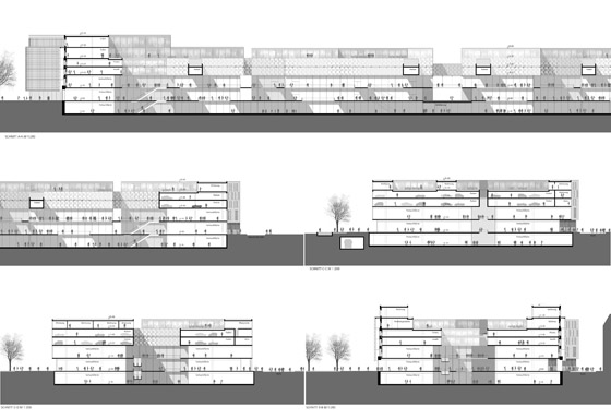 Die Primärkonstruktion besteht aus Decken und Stützen in Stahlbeton. In den Fassaden wird das Thema der reliefierten Elemente von der "Blechbüchse" aufgegriffen und transformiert weiterentwickelt. Abschnitte in Metall wechseln mit reliefierten Werkstein elementen und mit bedruckten wie klaren Gläsern und schaffen eine lebendig texturierte Oberfläche. Variationen in Farbigkeit, Textur und Materialität unterstützen die Gliederung des großen Projekts in räumlich identifizierbare Abschnitte.