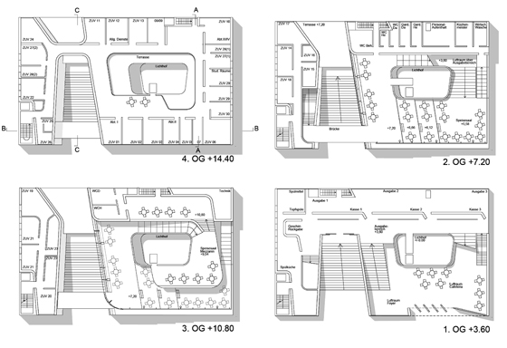 Die Mannigfaltigkeit der Gebäude-hülle wird bei diesem Projekt ausgehend von den Schnittflächen der Hohlräume entwickelt, nicht von den Außenkanten des städtebaulichen Bauvolumens. Letztere erscheinen überwiegend als Anschnitte, sind verglast und zeigen die Hülle als Kontur. So entsteht ein Spiel zwischen gekurvter Randkontur, kontinuierlicher Oberfläche und plastischem Raumvoluminen. Das Projekt versucht so, die suggestive Räumlichkeit skulpturaler Architektur mit den organisatorischen Vorteilen fließender Raumzuweisungen zu verbinden, die auch dem Erforderniss einer optimierten und reibungslosen Erschließung der Mensa Rechnung tragen.