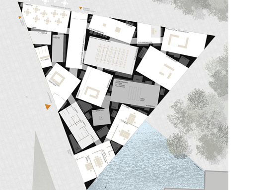 Das Besucherinformationszentrum der Grube Messel präsentiert sich als eingeschossiger Solitär in der Landschaft. Seine Dreiecksgeometrie zoniert den Aussenraum in drei Bereiche: Im Südwesten bildet sich ein Eingangsbereich mit Vorzone an der öffentlichen Erschließung. Nach Norden öffnet sich das Gebäude zu einer terrassierten Parklandschaft, die bis an den Grubenrand und zur Aussichtsplattform reicht. Nach Südosten hingegen entsteht ein ruhigerer, hofartiger Gartenbereich mit Wasserfläche.