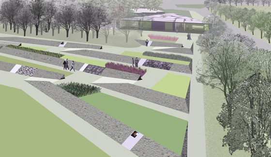 Das leichte Gefälle des Geländes zum Grubenrand hin wird durch Terrassierungen inszeniert. Hier ist die Landschaft auf der Weitblick angelegt und soll daher unverstellt bleiben. Die Geometrie der Terrassen nimmt Bezug auf die Form und Terrassierung der Grube. Die niedrigen Böschungskanten werden überhöht mit Sitzstufen und Brüstungen ausgeführt, und können so dann auch als geneigte Wandflächen für Exponate, Gesteinsproben und Musterpflanzungen genutzt werden. Auf diese Weise entsteht entlang der Geländeterrassierung ein zwangloses landschaftliches Ausstellungssystem quasi "en passant". Der Kinderspielplatz wird an der Waldkante als "Naturspielplatz" angelegt, so dass der Wald als Spielfläche mitgenutzt werden kann.