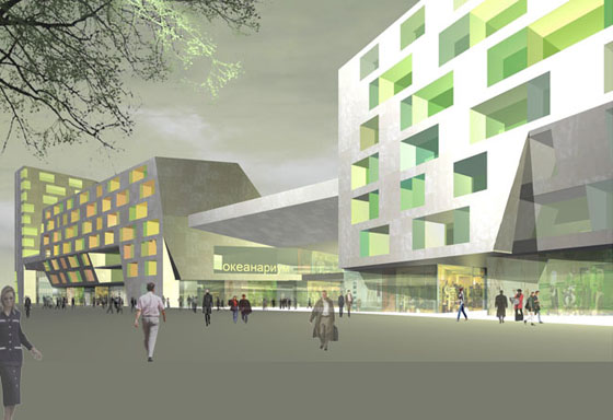Der städtebauliche Kontext ist von großmaßstäblichen Achsen geprägt. Das Projekt vereint ein Einkaufs-zentrum mit einem Aquarium, einem Hotel mit Konferenzzentrum, Büros und Wohnungen. Es bildet in sich eine Stadt im Kleinen.