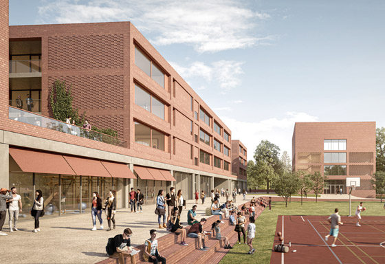 Mit deutlichen Raumkanten nach außen begrenzen die Bauten des Campus den geschützten Schulhofbereich. Die städtebauliche Vorgabe wird unter Ein-haltung der Baugrenzen als Komposition aus drei Baukörpern gleicher Materialität, jedoch unterschiedlicher Volumetrie und Ausrichtung interpretiert. Der lagernde, viergeschossige Hauptbaukörper ent-lang der Jaffestraße tritt in einen Dialog mit dem kubisch aufragenden Volumen des fünfgeschossigen 'Turms' an der Südkante, während die Sporthalle als am stärksten erdverhaftetes Bauwerk mit einer charakteristischen Dachkontur den Schulhof nach Norden begrenzt. Wie es der städtebauliche Rahmenplan vorsieht, tritt die Schule als Langbau den drei Blöcken auf der Ostseite der Jaffe-straße gegenüber. Der im Städtebau angelegte Versatz des Baukörpers entlang der Straße wird jedoch bewusst nicht aufgegriffen: Die Raumwirkung der Straße könnte ungleich stärker sein, wenn den sich versetzenden Blöcken an der Ostseite eine gerade Kante an der Westseite gegenübersteht.