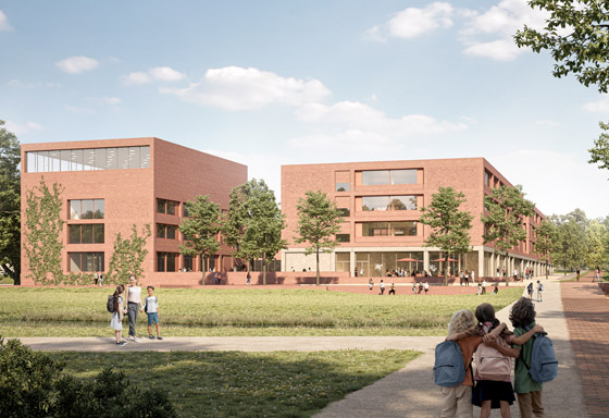 Mit deutlichen Raumkanten nach außen begrenzen die Bauten des Campus den geschützten Schulhofbereich. Die städtebauliche Vorgabe wird unter Ein-haltung der Baugrenzen als Komposition aus drei Baukörpern gleicher Materialität, jedoch unterschiedlicher Volumetrie und Ausrichtung interpretiert. Der lagernde, viergeschossige Hauptbaukörper ent-lang der Jaffestraße tritt in einen Dialog mit dem kubisch aufragenden Volumen des fünfgeschossigen 'Turms' an der Südkante, während die Sporthalle als am stärksten erdverhaftetes Bauwerk mit einer charakteristischen Dachkontur den Schulhof nach Norden begrenzt. Wie es der städtebauliche Rahmenplan vorsieht, tritt die Schule als Langbau den drei Blöcken auf der Ostseite der Jaffe-straße gegenüber. Der im Städtebau angelegte Versatz des Baukörpers entlang der Straße wird jedoch bewusst nicht aufgegriffen: Die Raumwirkung der Straße könnte ungleich stärker sein, wenn den sich versetzenden Blöcken an der Ostseite eine gerade Kante an der Westseite gegenübersteht.