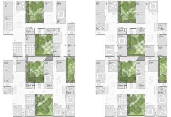 Das Erdgeschoss wird durch drei Höfe strukturiert, die diese Ebene in ihrer Tiefe belichten und die ihrerseits