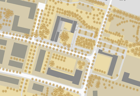 Die städtebauliche Figur der neuen Studentenwohnanlage nimmt die L-Form des städtebaulichen Entwurfs auf. Der Neubau tritt somit in ein Verhältnis zu den verbliebenen zwei Altbauten der ehemaligen Kaserne. Die drei Bauten formen eine Art Kernbereich am östlichen Ende des neuen Quartiers.