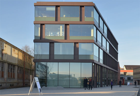 Die Materialität der Architektur soll die Lesbarkeit der Kantenführung und der städtebaulichen Körnung unterstützen. Deshalb wird auf kleinteilige Binnengliederungen der Baukörper -wie sie den Südcampus auszeichnen- verzichtet. Präzise geschnittene Volumina mit metallischen und gläsernen Fassaden erzeugen zusammen mit den (werk-)steinernen Plateaus der überformten Topographie ein räumliches und materielles Kontinuum über die Einzelbauten hinweg. Die volumetrische Klarheit und Großzügigkeit der alten Fabrikgebäude, wie z.B. der Produktionshalle wird dabei zur Anregung.
